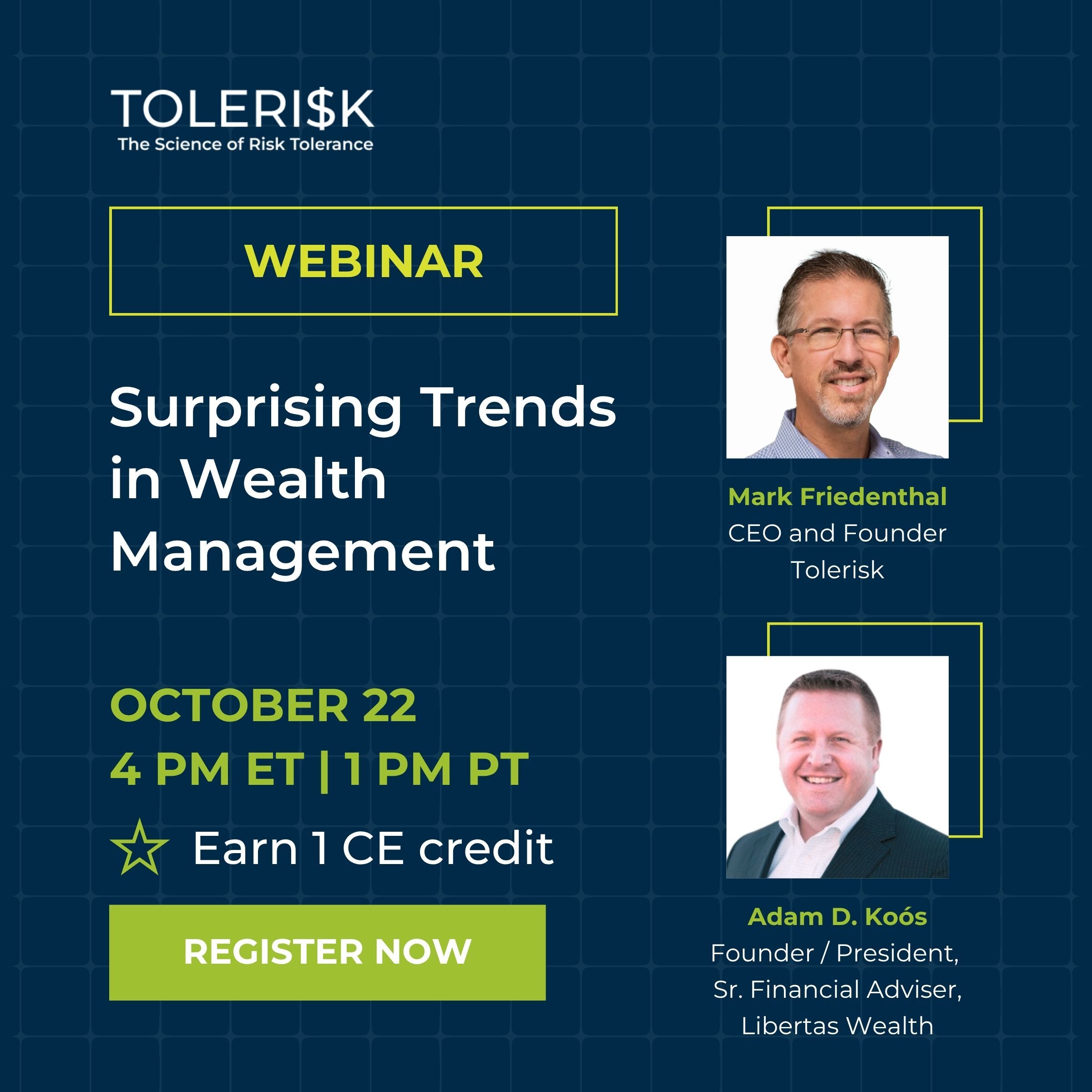 Join the Tolerisk Thought Leader Speaker Series on October 22 at 4 pm for a conversation with renowned advisor Adam Koós, CFP®, CMT, CFTe, CEPA, and Tolerisk CEO Mark Friedenthal.